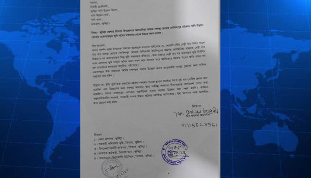 আবেদনকারী জয়নাল আবেদিন বলেন, অবৈধ স্থাপনা উচ্ছেদ করে দখলমুক্ত করতে আমি পানি উন্নয়ন বোর্ড কুমিল্লা, নির্বাহী প্রকৌশলী বরাবর আবেদন করেছি।