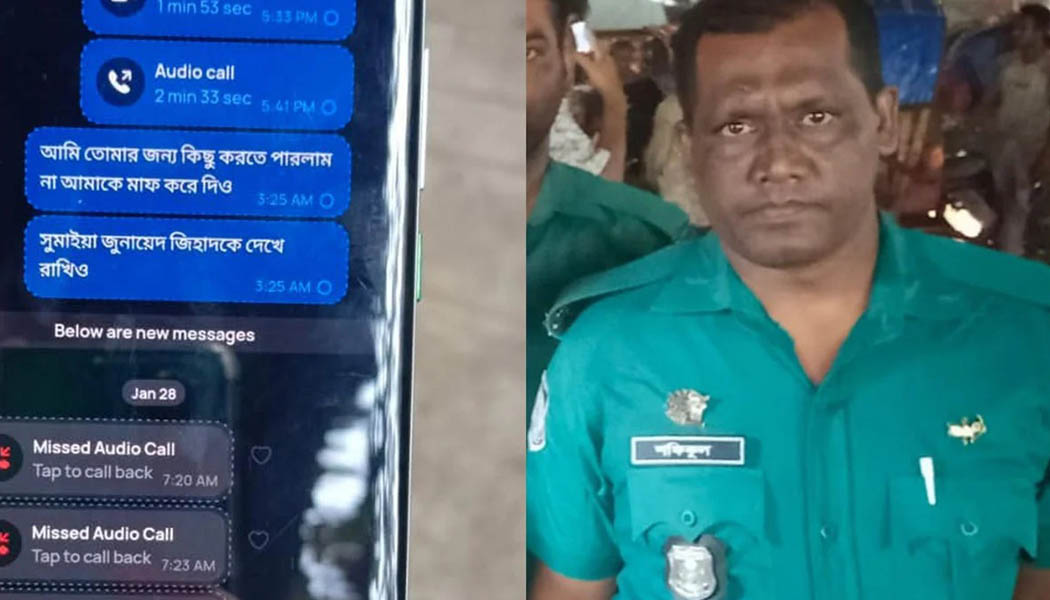 রাজধানীর যাত্রাবাড়ী পুলিশ ফাঁড়িতে কর্মরত শফিকুল ইসলাম (৪২) নামে এক পুলিশ সদস্য আত্মহত্যা করেছেন। ভোর রাত ৩টা ২৫ মিনিটে তার বড় মেয়েকে মোবাইলে ম্যাসেজ করে আত্মহত্যা করেন। তবে আত্মহত্যার কারণ জানা সম্ভব হয়নি।