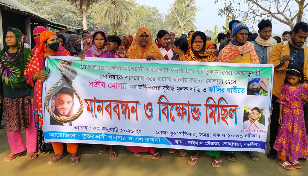 স্ত্রী হত্যার অভিযোগে স্বামী সজিবের ফাঁসির দাবীতে মানববন্ধন